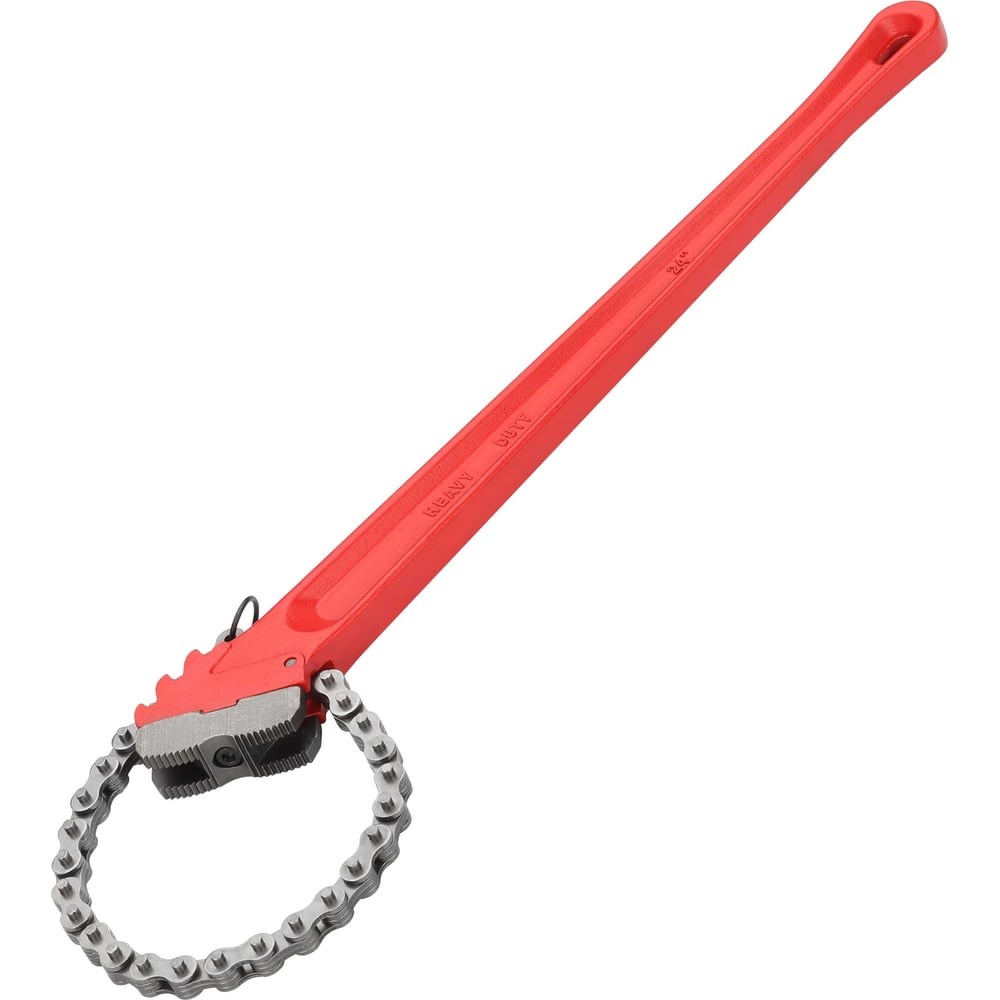 Односторонний цепной ключ с двойными губками REKON 24" 028424 может использоваться в труднодоступных местах для захвата труб диаметром от 75 до 125 мм. Его двойные губки из легированной стали позволяют вращать трубу в двух направлениях, обеспечивая надежную фиксацию. Головка ключа оснащена специальными зубьями, а крепкая цепь имеет улучшенную термообработку. Благодаря порошковому покрытию рукоятка защищена от образования коррозии.