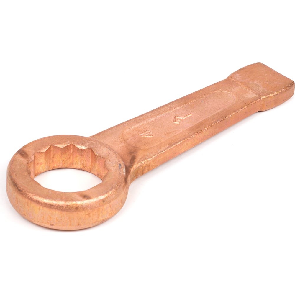 Двусторонний накидной ударный ключ предназначен для работ с резьбовыми соединениями в процессе ремонтных и монтажных работ. Инструмент выполнен из высококачественной стали, благодаря чему отличается прочностью и долговечностью. Омедненное покрытие обладает повышенной устойчивостью к высокотемпературному воздействию случайной искры. Ключ может применяться на предприятиях с наличием потенциально опасных сред, а также в быту. Одна из рабочих поверхностей ключа предназначена для ударных воздействий с целью увеличения усилия при работе с тугими крепежными соединениями.