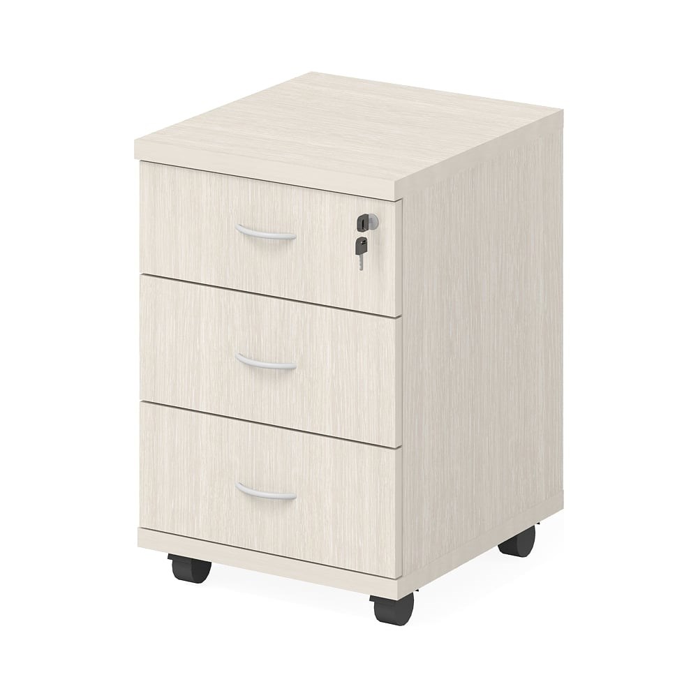 Офисная тумба ФЕЛИКС 42.7x45.8x63.2 см дуб альпийский ПК-ЛОГ-ТММ43x46-В1-30 ПК-ЛОГ-ТММ43Х46-В1-30 создает удобное хранение документов, офисных принадлежностей, личных вещей сотрудника. Тумба мобильная имеет 3 обычных ящика. Верхний ящик запирается замком. Ящики устанавливаются на роликовые направляющие. Верхняя полка изготавливается из ЛДСП 16 мм и кромкой ПВХ 2 мм. Нижняя полка изготовлена из ЛДСП, по 4 сторонам покрыта тонкой пластиковой кромкой. Все другие детали изготавливаются из ЛДСП 16 мм и покрыты ПВХ 0,45 мм. Каркасы ящиков в тумбе приставной состоят из фолдингов, передних панелей и дна изготовленного из древесноволокнистой плиты (ДВП) толщиной 3,2 мм. Ручки – пластиковые скобы (межцентровое расстояние – 96 мм). Мобильная тумба устанавливается на роликовые опоры.