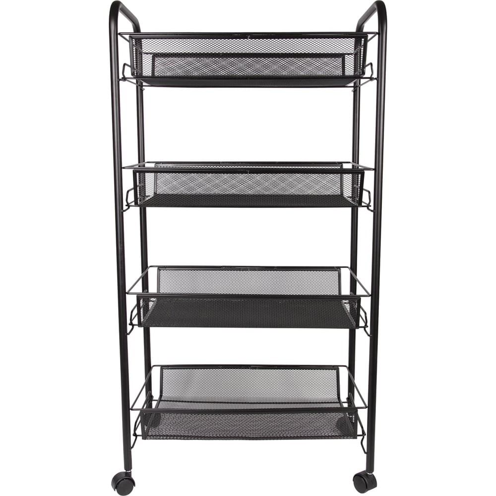 Офисно-бытовая этажерка BRABIX предназначена для хранения хозяйственных товаров, канцелярских принадлежностей, документов и предметов обихода в офисах и в быту. Ее применение позволяет оптимально организовать рабочее пространство, сэкономить место.Максимальная нагрузка на каждый из 4 ярусов этажерки - до 5 кг.Изготовлена из прочного металла.Диаметр несущих трубок – 13 мм.Выполнена в черном цвете, который будет гармонировать с большинством офисных и домашних интерьеров.Этажерка оснащена самоориентирующимися колёсами, позволяющими с легкостью перемещать её во время уборки, не повреждая напольное покрытие.Размеры модели - 43,5х26х83,5 см.Вес - 3 кг.Собирается без использования крепежа.