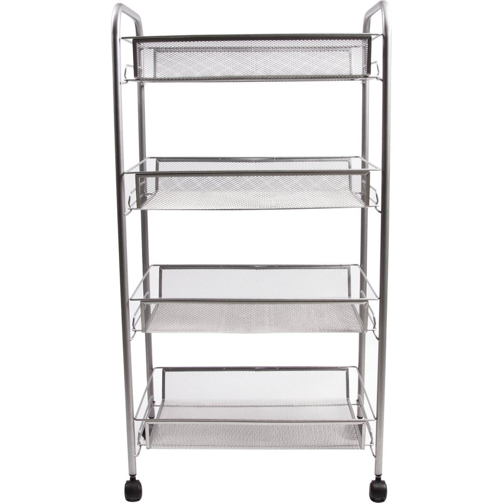 Офисно-бытовая этажерка BRABIX предназначена для хранения хозяйственных товаров, канцелярских принадлежностей, документов и предметов обихода в офисах и в быту.Ее применение позволяет оптимально организовать рабочее пространство, сэкономить место.Максимальная нагрузка на каждый из 4 ярусов этажерки - до 5 кг.Изготовлена из прочного металла.Диаметр несущих трубок – 13 мм.Выполнена в серебристом цвете, который будет гармонировать с большинством офисных и домашних интерьеров.Этажерка оснащена самоориентирующимися колёсами, позволяющими с легкостью перемещать её во время уборки, не повреждая напольное покрытие.Размеры модели - 43,5х26х83,5 см. Вес - 3 кг.Собирается без использования крепежа.