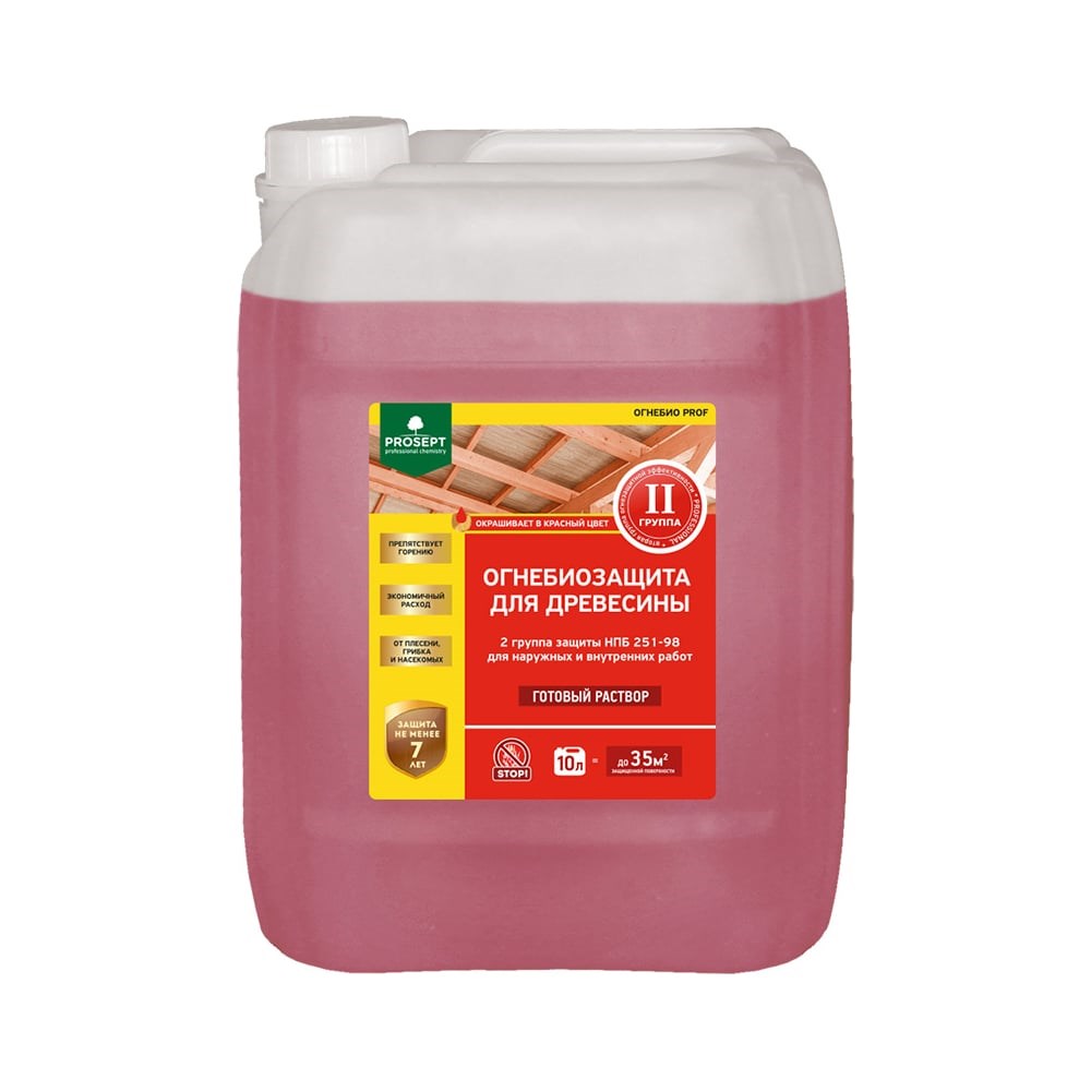 Огнебиозащита для древесины PROSEPT ОГНЕБИО PROF 2-ая группа 10 л 006-10к - имеет обязательный пожарный сертификат. Может использоваться внутри помещений и на открытом воздухе без прямого воздействия атмосферных осадков и контакта с грунтом. Пропитка защищает от возникновения и распространения огня, а также от воздействия насекомых и грибков.Переводит древесину в трудновоспламеняемый материал. При воздействии высоких температур на обработанной древесине протекает химическая реакция с высоким поглощением тепла и выделением негорючих газов. Одновременно на поверхности древесины образуется огнестойкий теплоизоляционный слой, который перекрывает доступ кислорода, не дает возможность древесине поддерживать горение.Подходит для обработки как новых конструкций, так и ранее обработанных огнезащитными составами.Пропитка устойчива к старению, не высаливается и не выщелачивается.Не оказывает негативного воздействия на свойства древесины, не изменяет ее структуру, не препятствует дальнейшей обработке, склеиванию и окраске любыми ЛКМ. При обеспечении невымываемости препарата, срок защиты составит не менее 7 лет.Суммарный расход для обеспечения огнезащитных свойств по II группе (трудновоспламеняемая древесина) — не менее 300 г/кв. м.Обработанную древесину следует защитить от попадания воды и атмосферных осадков.При обработке древесины необходимо защитить стеклянные поверхности!Не содержит канцерогены, безопасна для людей и животных.