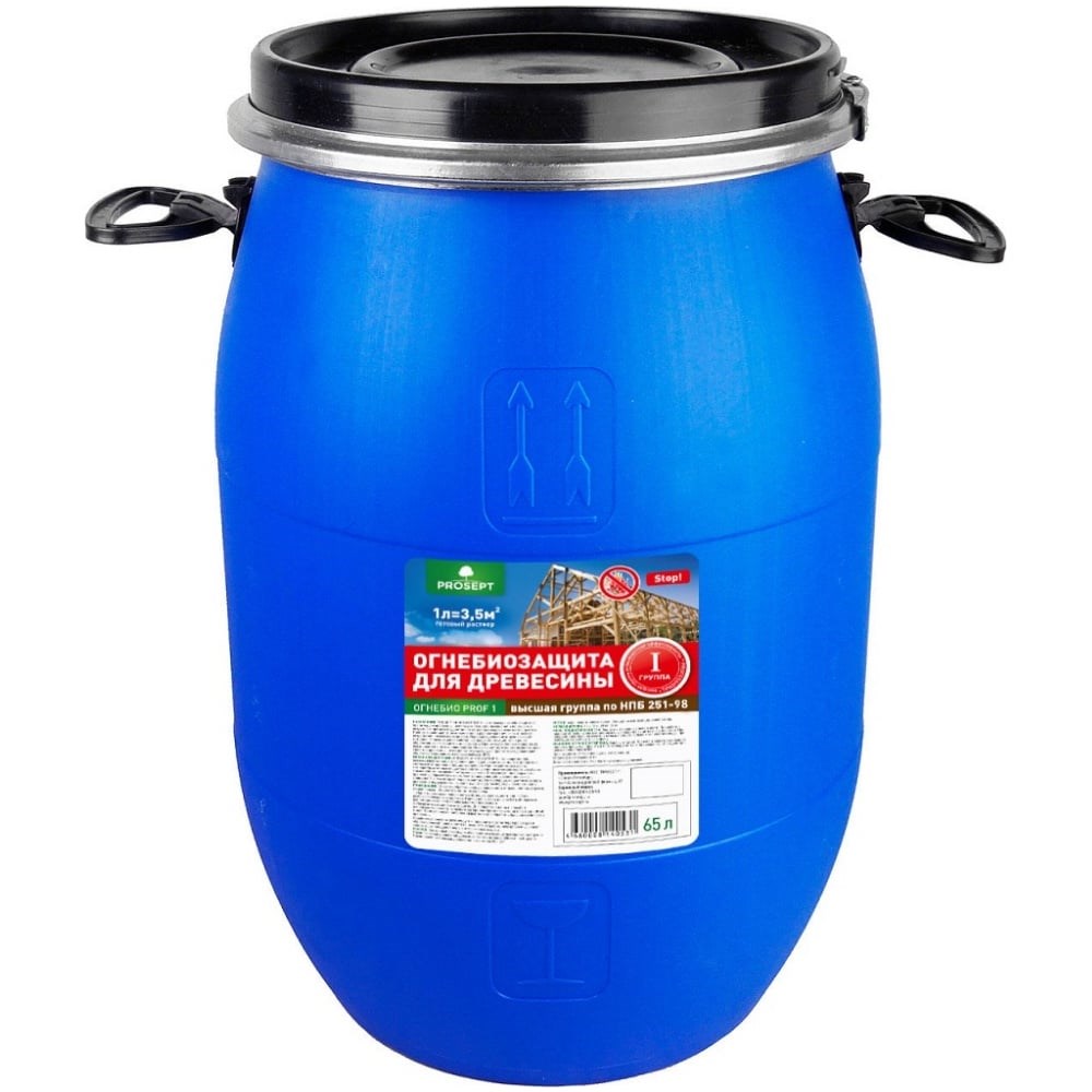 Огнебиозащита для древесины PROSEPT ОГНЕБИО PROF 1, 1 группа 65 л 007-65 имеет обязательный пожарный сертификат.Может использоваться внутри помещений и на открытом воздухе. Пропитка защищает от возникновения и распространения огня, а также от воздействия насекомых и грибков. Переводит древесину в трудногорючий материал. Подходит для обработки как новых конструкций, так и ранее обработанных огнезащитными составами.Пропитка устойчива к старению, не высаливается и не выщелачивается.Не оказывает негативного воздействия на свойства древесиныНе изменяет ее структуру, не препятствует дальнейшей обработке, склеиванию и окраске любыми ЛКМ.При обеспечении невымываемости препарата, срок защиты составит не менее 7 лет.При воздействии высоких температур на обработанной древесине протекает химическая реакция с высоким поглощением тепла и выделением негорючих газов. Одновременно на поверхности древесины образуется огнестойкий теплоизоляционный слой, который перекрывает доступ кислорода, не дает возможность древесине поддерживать горение и достигнуть температуры воспламенения.Суммарный расход для обеспечения огнезащитных свойств по I группе (трудногорючая древесина) должен составить не менее 500 г/кв. м; по II группе (трудновоспламеняемая) — не менее 300 г/кв. м.Нанесение состава должно быть обильным и равномерным при температуре не ниже +5 градусов. Обработанную древесину следует защитить от попадания воды и атмосферных осадков.Не содержит канцерогены. Безопасна для людей и животных.
