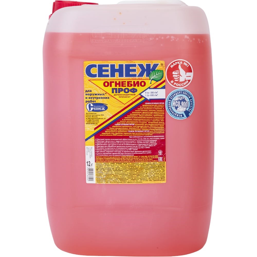 Огнебиозащита для древесины СЕНЕЖ ОГНЕБИО ПРОФ канистра, 12 кг 11814 предназначена для комплексной защиты древесины от горения, воспламенения, распространения пламени, гниения, плесени, синевы и насекомых-древоточцев внутри помещений и на открытом воздухе (под навесом) в условиях гигроскопического и конденсационного увлажнения без контакта с грунтом, воздействия атмосферных осадков, почвенной влаги. Область применения: Средство используют для новых и ранее обработанных антипиреном или антисептиком деревянных стропил, балок, ферм, обрешеток, перекрытий, обшивок, перегородок, стен и других пиленых, строганных, рубленых элементов конструкций жилищного, общественного, производственного и сельскохозяйственного назначения на расчетный средний срок огнезащиты 8 лет. Не применяют по поверхностям, ранее покрытым олифой, краской, лаком, другими пленкообразующими или водоотталкивающими материалами. Способ использования: Продукт наносят на очищенную от грязи, пыли, коры, луба, прочих покрытий поверхность древесины кистью, валиком, распылителем при температуре воздуха не ниже +5 градусов, а также погружением, вымачиванием или автоклавированием. Состав распределяют кистью, валиком, распылителем в 2-3 приема с интервалом 20-40 минут. Внимание! Не обрабатывать мерзлую древесину. Не смешивать с другими составами. Расход: Для обеспечения огнезащитных свойств по I группе (трудногорючая древесина) не менее 600 г/кв. м. Для обеспечения огнезащитных свойств по II группе (трудновоспламеняемая древесина) и биозащиты не менее 300 г/кв. м.