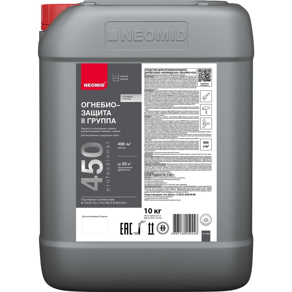 Огнебиозащитный состав NEOMID 450 2 группа 10 кг Н-450(2)-10/гот. защищает древесину на срок до 7 лет от возгорания и распространения пламени, обеспечивая II группу огнезащитной эффективности согласно ГОСТ Р 53292 (переводя древесину в трудновоспламеняемый материал), и на срок 8-10 лет от гниения, возникновения плесени, при отсутствии контакта с влагой. Применяется как защитная пропитка для обработки деревянных стен, балок, стропильных систем, несущих брусьев, перекрытий, лаг, оконных и дверных блоков, а также других конструкций из древесины различного назначения.Огнебиозащитная пропитка не оказывает негативного воздействия на свойства древесины, не изменяет ее структуру и цвет, не препятствует дальнейшей обработке, склеиванию и окраске.