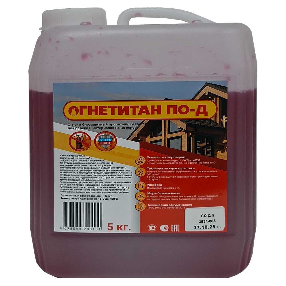 Огнебиозащита Огнетитан ПО Д 5кг БП-00000972 разработан для защиты дерева и деревянных конструкций которые эксплуатируются как во внутренних помещениях, так и снаружи (под навесом). Пропитка древесины огнезащитным составом проводится для предотвращения распространения и возникновения огня, а также для биозащиты древесины.Обработка огнезащитным пропиточным составом деревянных конструкций переводит их в К0(15), КМ1, КМ2, I(трудногорючую) и II (трудновоспламеняемую) группу огнезащитной эффективности. Огнезащитная пропитка не образует солевых или щелочных разводов на поверхности деревянных конструкций. Огнезащитный пропиточный состав не изменяет структуру дерева, не влияет на его свойства и не препятствует склеиванию, окраске или другой последующей обработке.