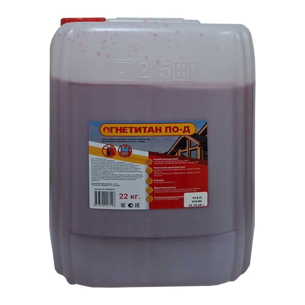 Огнебиозащита Огнетитан ПО Д 22кг БП-00000973 разработан для защиты дерева и деревянных конструкций которые эксплуатируются как во внутренних помещениях, так и снаружи (под навесом). Пропитка древесины огнезащитным составом проводится для предотвращения распространения и возникновения огня, а также для биозащиты древесины.Обработка огнезащитным пропиточным составом деревянных конструкций переводит их в К0(15), КМ1, КМ2, I(трудногорючую) и II (трудновоспламеняемую) группу огнезащитной эффективности. Огнезащитная пропитка не образует солевых или щелочных разводов на поверхности деревянных конструкций. Огнезащитный пропиточный состав не изменяет структуру дерева, не влияет на его свойства и не препятствует склеиванию, окраске или другой последующей обработке
