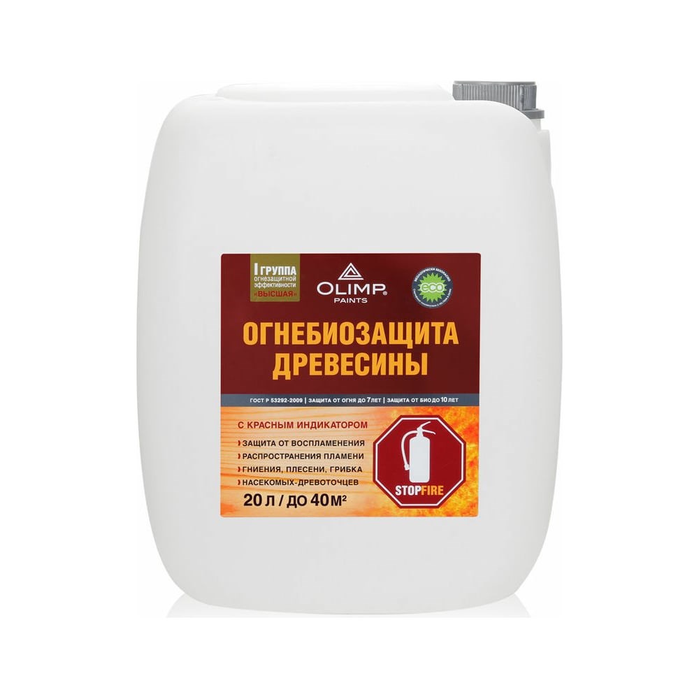 Огнебиозащита OLIMP Огнебио I кат 20 л 29637 переводит древесину в трудновоспламеняемый и трудногорючий материал в соответствии с ГОСТ P 53292-2009 и 1 группой огнезащитной эффективности. Защищает деревянные элементы строений, конструкций и изделий: стропила, балки, фермы, ригели, обрешётки, перекрытия, мауэрлаты. Огнезащитный эффект до 7 лет. Биозащитный эффект до 10 лет.