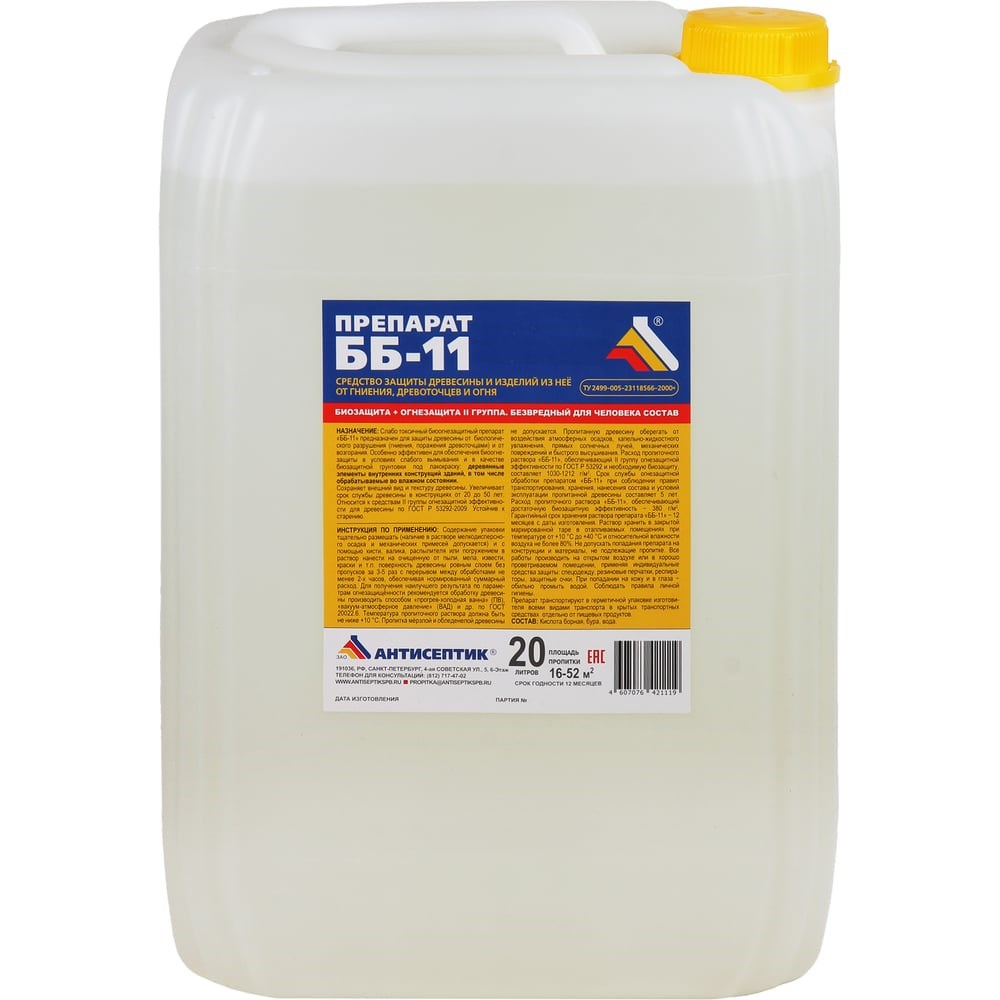 Огнебиозащита ЗАО "Антисептик" ББ-11 канистре 20 литров 00-00003393 обеспечивает защиту древесины от биологического разрушения (гниения, поражения древоточцами) в условиях IV-VII классов службы по ГОСТ 20022.2-80 и от возгорания, а также для защиты от биологического разрушения лесоматериалов и заготовок, обрабатываемых во влажном состоянии. Объекты защиты: деревянные конструкции не подверженные вымыванию или подверженные слабому вымыванию (деревянные элементы внутренних конструкций, тара, в т.ч. пищевая, стеллажи и т.п.). Препарат «ББ-11» слабо токсичный, водорастворимый, 2-х компонентный биоогнезащитный пропиточный состав. Без запаха, не окрашивает древесину, не вызывает коррозии черных металлов. Пропитанная древесина склеивается и окрашивается. Защищенная биоогнезащитным препаратом «ББ-11» древесина приобретает стойкость к воздействию биологических агентов ее разрушения (бактерий, грибов, насекомых) и воздействию огня. Пропитка деревянных конструкций препаратом «ББ-11» увеличивает срок службы древесины от 20 до 50 лет в зависимости от поглощения (удержания) препарата древесиной и условий ее эксплуатации. Препарат «ББ-11» относится к средствам II группы огнезащитной эффективности для древесины по ГОСТ 53292-2009. Устойчив к старению. Гарантийный срок службы огнезащитной обработки препаратом ББ-11 от одного года и более в зависимости от поглощения (удержания) препарата древесиной и условий ее эксплуатации.