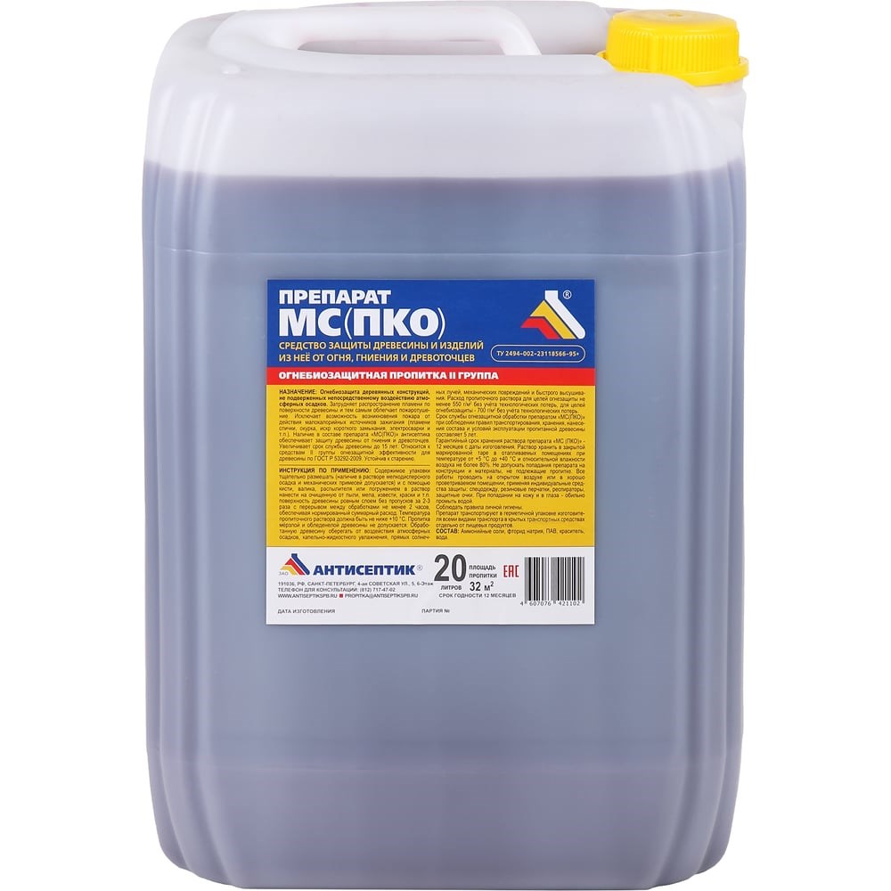 Огнебиозащитная пропитка ЗАО "Антисептик" МС (ПКО) в канистре 20 литров 00-00003591 предназначена для обработки различных пород древесины, которые не подвергаются непосредственному воздействию атмосферных осадков. Состав наносится на деревянные конструкции, которые эксплуатируются внутри помещений (стропила, обрешетки кровли, ходовые мостики, подмости, строительные леса). Препарат «МС» (ПКО)-водорастворимый, 3-х компонентный огнебиозащитный состав для поверхностной пропитки древесины и изделий из неё. Поверхностная огнезащитная пропитка затрудняет распространение пламени по поверхности древесины и тем самым облегчает пожаротушение. В ряде случаев она исключает возможность возникновения пожара от действия малокалорийных источников зажигания (пламени спички, окурка, искр короткого замыкания, электросварки и др.). Препарат «МС» (ПКО) незначительно корродирует черные металлы. Биозащита препаратом «МС» (ПКО) увеличивает срок службы древесины до 15 лет. Препарат «МС» (ПКО) относится к средствам II группы огнезащитной эффективности для древесины по ГОСТ Р 53292-2009. Устойчив к старению. Гарантийный срок службы огнезащитной обработки препаратом «МС» (ПКО) от одного года и более в зависимости от поглощения (удержания) препарата древесиной и условий ее эксплуатации.