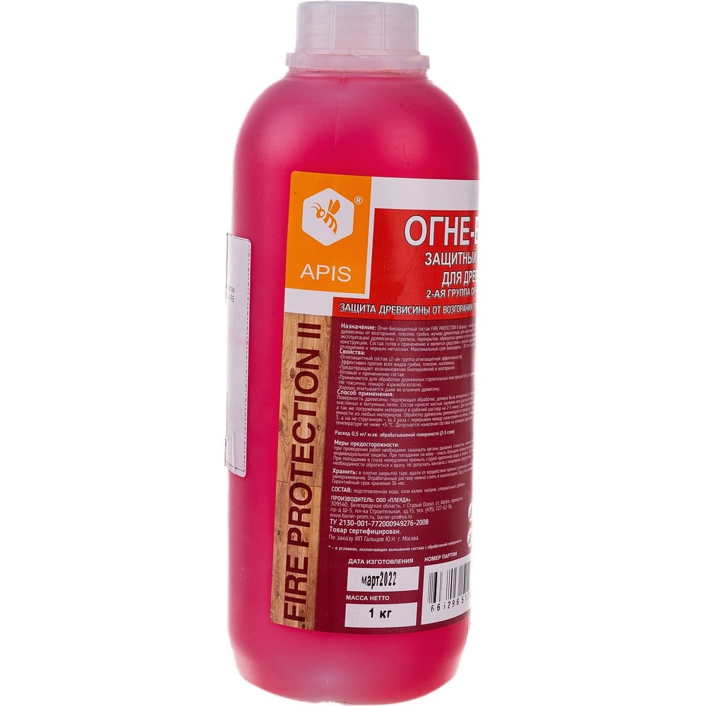 Огнебиозащитный состав для древесины APIS FIRE PROTECTION БАРЬЕР Эконом, бутылка 1 кг 4665296512383 препятствует поражению грибками, водорослями и насекомыми-древоточцами. Продукт обеспечивает II (типовую) группу огнезащитной эффективности, предотвращает возгорание и распространение огня. Средство придает поверхности красный оттенок, исключая появление необработанных участков.