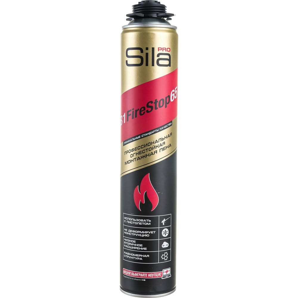 Sila Pro B1 Firestop 65, ОГНЕСТОЙКАЯ профессиональная монтажная пена, 850мл SPFR65 предназначена для профессионального применения в условиях повышенных требований пожарной безопасности. Обладает высокой устойчивостью к воздействию высоких температур, сохраняя герметичность шва в течение 240 минут (EI 240).Основные характеристики:Группа воспламеняемости: В1 (трудновоспламеняемая)Класс горючести: Г1 (слабогорючая по ГОСТ 30244-94)Предел огнестойкости: до EI 240 (в зависимости от ширины и глубины шва)Время образования пленки: 8 минутВремя предварительной обработки: от 40 минутВторичное расширение: до 25%Отличная адгезия к различным строительным материаламПрименение:Установка, герметизация и фиксация огнестойких оконных и дверных блоков, подоконников, стеновых панелей, перегородок.Монтаж конструкций в помещениях с высоким классом пожарной защиты.Изоляция и герметизация трубопроводов, кабельных проходок, инженерных коммуникаций.Теплоизоляция водопроводных, канализационных сетей, систем центрального отопления, кровельных перекрытий.Преимущества:Обеспечивает длительную огнезащиту (до 4 часов).Минимальное вторичное расширение – снижает риск деформации конструкций.Универсальность применения в различных строительных и монтажных работах.Соответствие строгим нормам пожарной безопасности.Рекомендации по использованию: Пена предназначена для профессионального применения. Перед нанесением поверхность необходимо очистить и увлажнить.