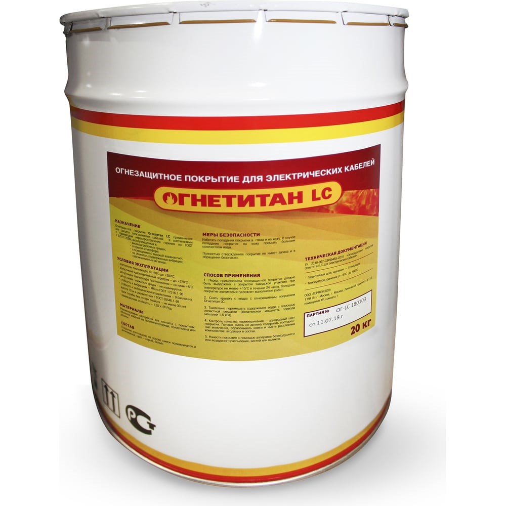 Огнезащитное покрытие для электрических кабелей Огнетитан LC цвет белый 20 кг применяется для предотвращения распространения горения по кабелям, прокладываемым в кабельных сооружениях, эстакадах, коробах, лотках, а также по кабельным конструкциям внутри и снаружи зданий и сооружений, на наиболее ответственных кабельных линиях управления, защиты, автоматики, электропитания ответственных механизмов и оборудования, а также участков кабелей, где наиболее вероятны механические повреждения или воздействие тепловых и огневых источников.Покрытие является огнезащитным и не оказывает разрушающих воздействий на оболочки кабеля из поливинилхлорида, резины, сшитого полиэтилена, алюминия, стали и свинца.Огнезащитные свойства покрытия соответствуют требованиям ГОСТ Р 53311 - 2009 «Покрытия кабельные огнезащитные. Требования пожарной безопасности Методы испытаний».Покрытие Огнетитан LC разработано для:кабельных линий (силовых, контрольных и связи) с резиновой, поливинилхлоридной или полиэтиленовой оболочкой;объектов энергетического комплекса;нефтегазохимических и промышленных предприятий;горно-обогатительных комплексов и шахт;гидротехнических сооружений;объектов ФОК, офисных и торговых зданий и сооружений.