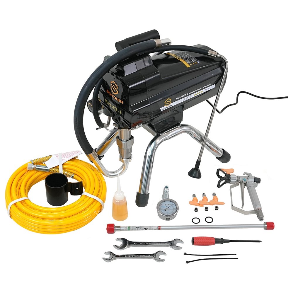Schtaer Mars 23.1 - аппарат безвоздушного распыления интерьерных и фасадных ЛКМ. Он работает от электрической сети 220 вольт. Краска поступает в окрасочный аппарат через шланг-заборник, поршневой насос нагнетает давление и подает краску по шлангу на краскопульт. Факел формируется на специальной форсунке с тонким сечением.