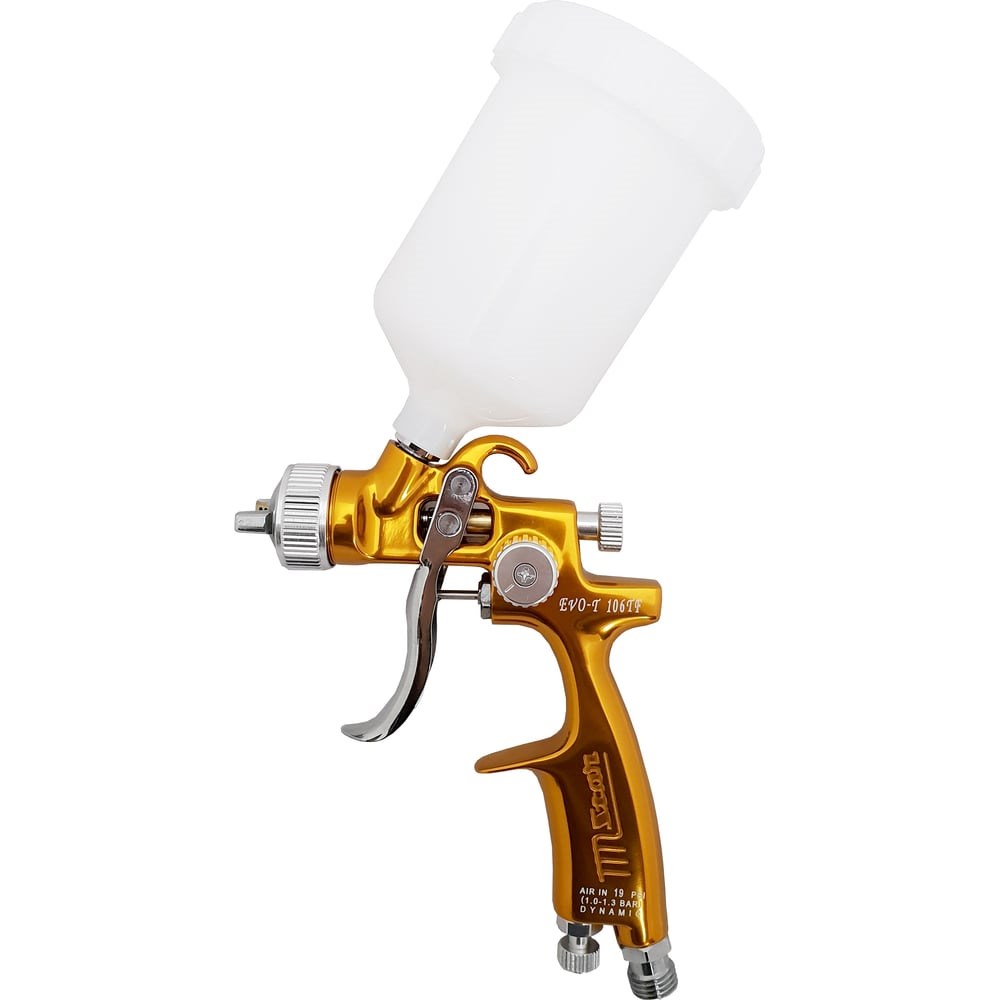 Окрасочный пистолет с верхним пластиковым бачком RADEX Star EVO-T-106TFG EVO-T-106TF-08G имеет малый размер. Легок в обращении и предназначен для точечной окраски и окраски небольших поверхностей. Емкость бачков: 0,25 л (пластик).