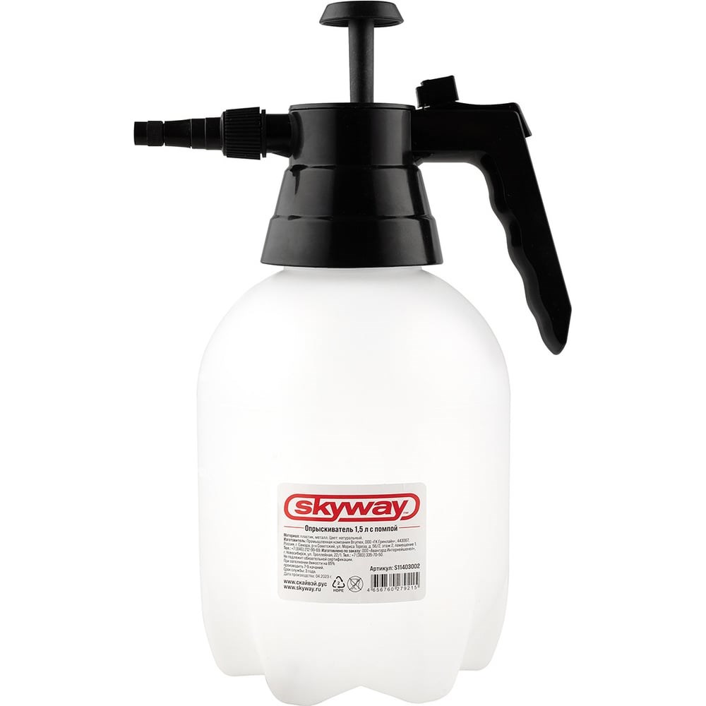 Опрыскиватель SKYWAY 1.5 л, с помпой S11403002 предназначен для обработки любых поверхностей, включая растения. Представляет собой пластиковую бутылку с ручной помпой, которая создает давление внутри. Принцип действия основан на создании избыточного давления внутри емкости, в результате поток жидкости из распылителя выбрасывается направленным сильным потоком в виде взвеси мелких капель. Радиус действия распылителя 60-80 см. Тип распыления - от струи до тумана.