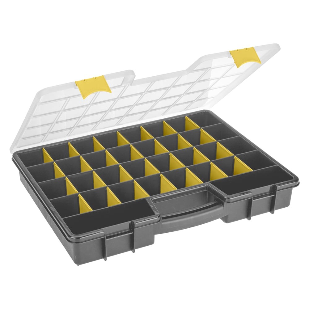 Органайзер Бытпласт WORKER, 480х370х70 мм, серый 433240511 поможет рассортировать крепежные и другие материалы: саморезы, гвозди, дюбели, болты, винты и пр. Внутри органайзера есть съемные подвижные разделители, с помощью которых при необходимости можно сформировать ячейки нужного размера. Прочные замки не позволят органайзеру раскрыться и просыпать содержимое. Благодаря цельной округлой ручке органайзер удобно переносить или снимать с полки. Прозрачная крышка позволяет видеть, что именно хранится внутри. Изготавливается из 100% перерабатываемого прочного безопасного полипропилена, не боится влажности и перепадов температур, легко моется.