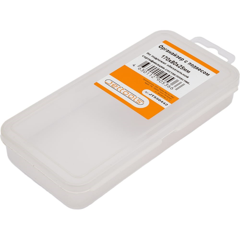 Органайзер с подвесом JETTOOLS 170x80x25 мм, 1 отделение JT550442 предназначен для хранения и переноски мелких крепежей, метизов и аксессуаров. Изделие выполнено из высококачественной пластмассы, благодаря чему отличается прочностью и долговечностью. Материал не содержит в составе вредных для здоровья веществ, а потому безопасен для здоровья. Прозрачная крышка позволяет увидеть содержимое органайзера. Наличие подвеса позволяет удобно хранить органайзер.