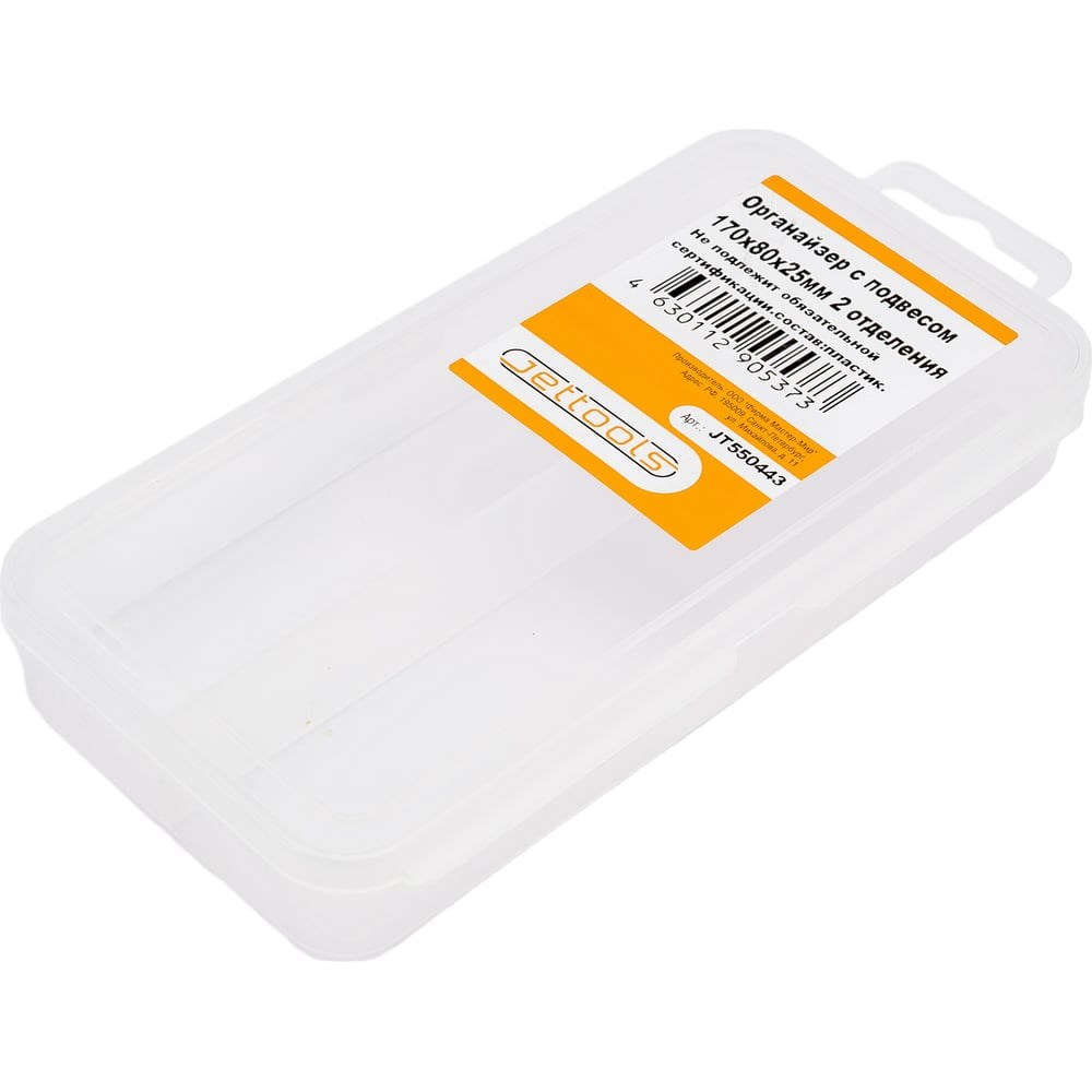 Органайзер с подвесом JETTOOLS 170x80x25 мм, 2 отделения JT550443 предназначен для хранения и переноски мелких крепежей, метизов и аксессуаров. Изделие выполнено из высококачественной пластмассы, благодаря чему отличается прочностью и долговечностью. Материал не содержит в составе вредных для здоровья веществ, а потому безопасен для здоровья. Прозрачная крышка позволяет увидеть содержимое органайзера. Наличие подвеса позволяет удобно хранить органайзер.