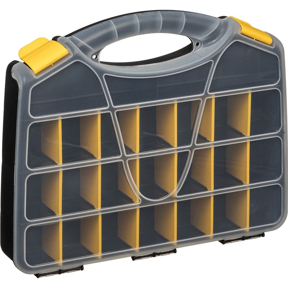 Органайзер для мелочей помогает содержать в порядке, переносить на место выполнения работ и быстро находить метизы и аксессуары. Идеален для использования дома, на даче, в гараже, мастерской, в автомобиле. Внутреннее деление на отсеки делает удобным размещение внутри органайзера деталей, которые необходимо отделить друг от друга. 18 съёмных перегородок позволяют изменять размер отсеков под личные нужды. Благодаря эргономичной ручке комфортно переносить даже полностью заполненный тяжёлый органайзер. За счёт загибов на защёлках органайзер легко открывается в перчатках. Прозрачная крышка позволяет увидеть содержимое, не открывая органайзер. Подходит для хранения рыболовных и швейных принадлежностей, коллекционирования, занятия хобби. Возможность использования навесного замка защитит содержимое от свободного доступа, в том числе обеспечит безопасность детей.