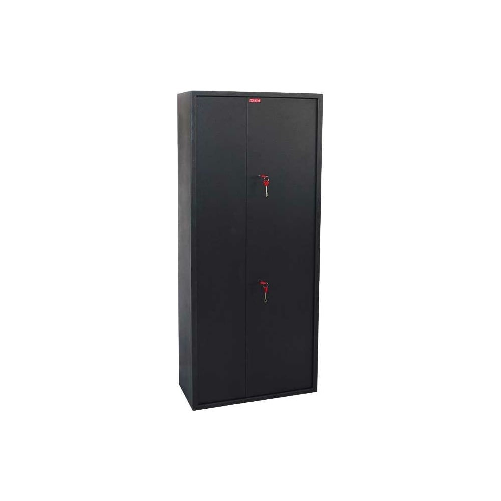 Оружейный шкаф Контур ОК - 10т 00012532 предназначен для хранения и ограничения несанкционированного доступа к гражданскому и служебному оружию, боеприпасам и принадлежностям. В верхней левой части располагается отсек ограниченного доступа (трейзер), запираемый на замок «почтового» типа, а в нижней 3 съемные полки, регулируемые по высоте. Правое отделение оборудовано 5-ю ложементами зажимного типа, предназначенные для упорядоченной укладки оружия и позволяющие сберечь оружие от царапин и потертостей. На дне отсека резиновый коврик красного цвета. В шкафу установлено два 8-ми сувальдных замка фирмы «ПРО САМ» (Россия) с классом устойчивости 2 по ГОСТ 5089-2003. Корпус шкафа изготовлен из стального листа толщиной 1,5 мм, полотно дверей – из листа толщиной 2 мм. Полотно двери изнутри усилено панелью коробчатого сечения из стального листа толщиной 0.8 мм, на которой располагаются дополнительные элементы (шомполодержатель, скоба, масленка). На задней стенке шкафа предусмотрено 2 отверстия ø7 мм для возможности крепления его к стене.