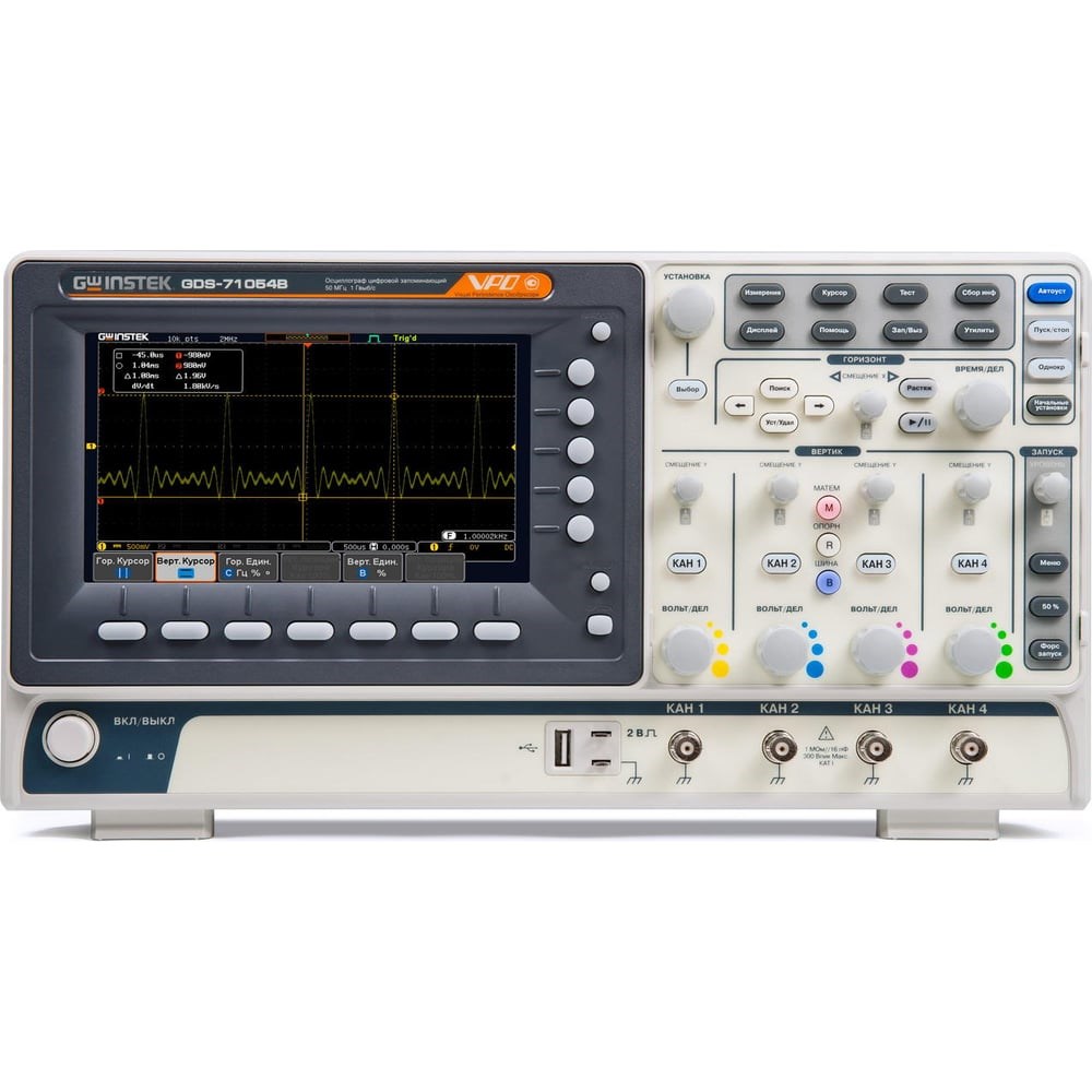 Осциллограф GW Instek GDS-71104B имеет 4 канала. Полоса пропускания составляет 100 МГц. Предусмотрено 36 видов автоматических измерений параметров. Крупный цветной дисплей обеспечивает удобное считывание информации. Сбор данных производится в режимах: выборка, пиковый детектор, усреднение, интер. Sin X/x. Внутренняя память прибора позволяет сохранить 24 осциллограммы, 20 профилей настроек.