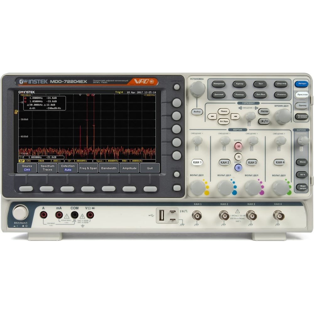 Осциллограф GW Instek MDO-72204EX обеспечивает регистрацию аналоговых, цифровых и радиочастотных сигналов. Может использоваться на промышленных объектах, в мастерских и учебных заведениях. Модель поддерживает 28 видов автоматических измерений различных параметров. Сбор данных осуществляется в режимах: выборка, пиковый детектор, усреднение, интерполяция Sin X/x. Внутренняя память позволяет сохранить 24 осциллограммы, 20 профилей настроек.