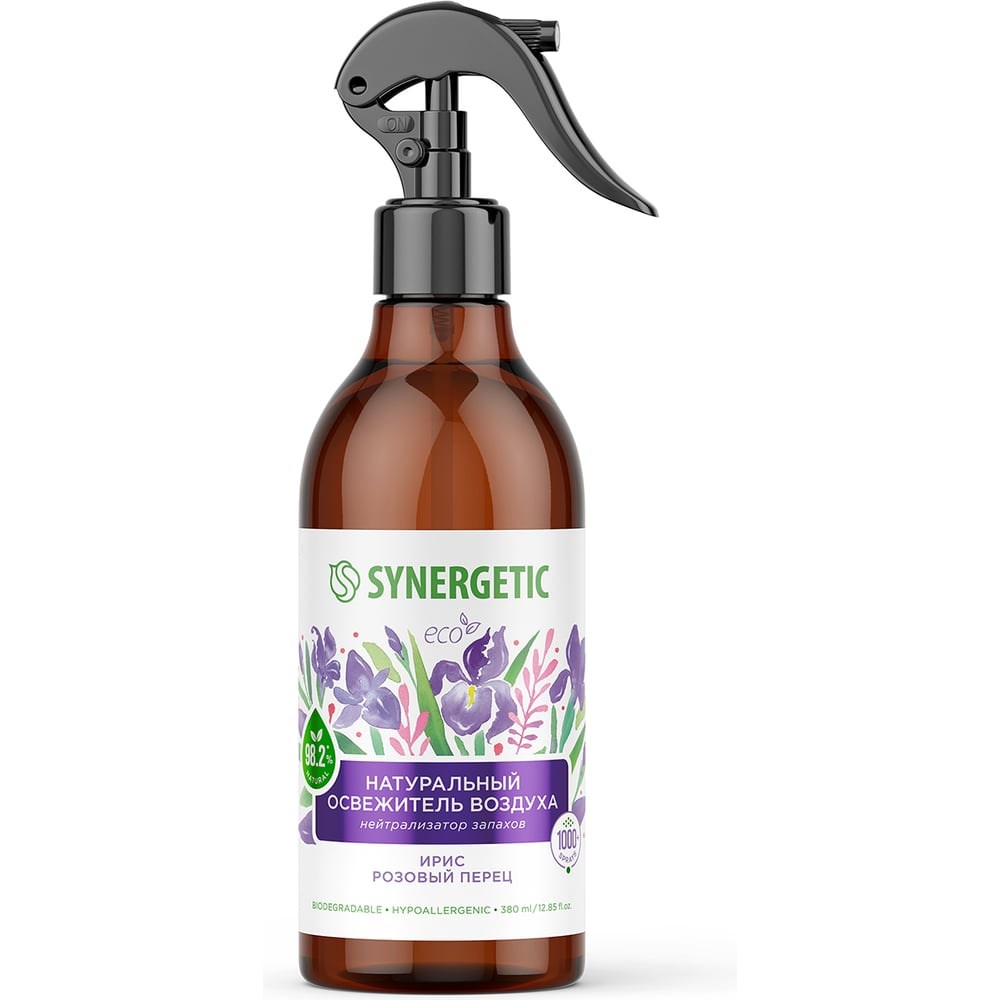 Освежитель воздуха SYNERGETIC Ирис и розовый перец 380 мл 900002 - биоразлагаемый освежитель воздуха, нейтрализатор запахов на водной основе на 98,2% состоит из натуральных компонентов. Парфюмерная композиция с эфирными маслами герани, розы и ириса наполняет воздух пряным цветочным ароматом. Гипоаллергенная формула безопасна для людей и животных. Благодаря 100% натуральному поглотителю запахов — соли полиитаконовой кислоты — освежитель эффективно устраняет стойкие запахи от приготовления пищи, домашних животных, табака и других источников неприятных запахов в гостиной, ванной комнате и санузле, спальне, коридоре, кухне, автомобиле, офисе и прочих помещениях. Подходит для устранения неприятных запахов с тканей (диванов, подушек, ковров, занавесок, простыней, тканевых автокресел, постельного белья), занавесок для душа и спортивных ковриков. Не оставляет следов на поверхностях, увлажняет воздух в помещении и способствует осаждению пыли. Не содержит парабенов, фреонов, газов-пропеллентов, фталатов и красителей.