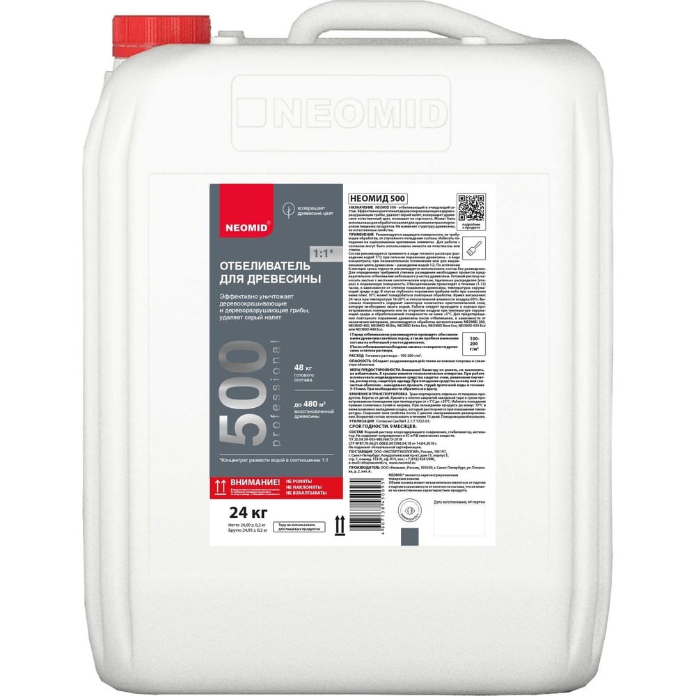 Отбеливающий состав для древесины Neomid 500 /24 кг/ - Н-500-24/к1:1 - это концентрат для глубокой очистки и защиты древесины любых пород. Уничтожает плесень, удаляет серый налет, возвращает древесине естественный цвет, тем самым повышая ее сортность. Обработанные поверхности безвредны для здоровья людей, животных и окружающей среды.