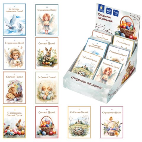 Открытки размером 7х10 см изготовлены из плотного картона 250 г/м2 с глянцевой поверхностью. Открытки поставляются в 10 уникальных дизайнах - с изображением пасхальных яиц, цыплят, кроликов, куличами, ангелочков, цветочных мотивов и нежных весенних узоров (без возможности выбора). Удобный формат открыток — идеален для того, чтобы положить в пакетик к куличу, прикрепить на упаковку, использовать как бирки или в качестве сувенира. А насыщенные краски и глянец придают открыткам праздничный блеск и делают их настоящим акцентом в любом оформлении. Поставляются в цветном картонном дисплее. Дисплей упакован в дополнительный гофрокороб.