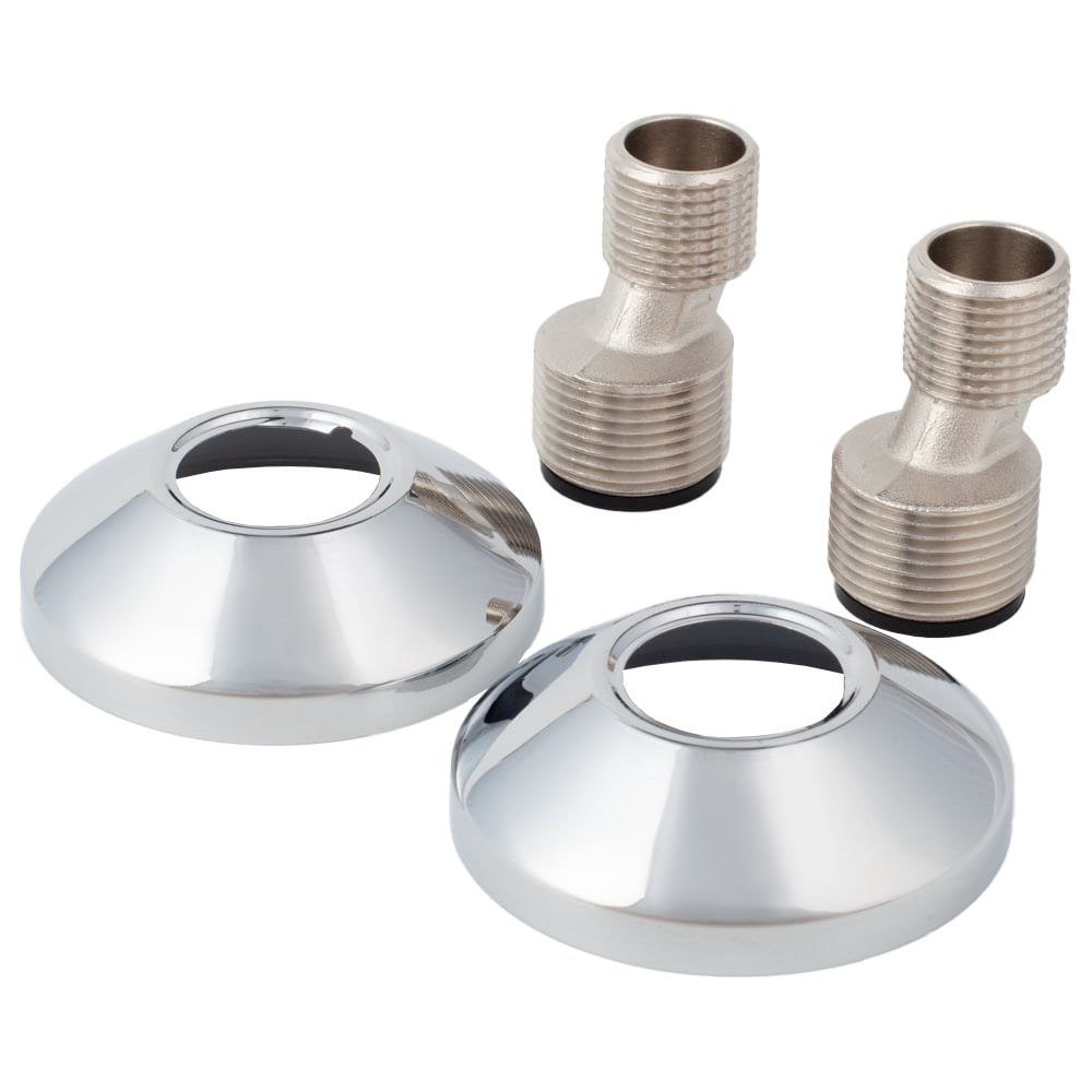 Комплект из отражателей базового дизайна для смесителя и эксцентриков, 2 шт. Универсальное решение для крепление любого смесителя для ванный на российском рынке - переходники - эксцентрики соединяют входные патрубки смесителя с водопроводной системой, а декоративные чашки-отражатели эстетично скрывают места соединения. Эксцентрики имеют засечки для лучшего сцепления с монтажной лентой, шумоподавляющие уплотнители. Изготовлены из прочных материалов: латуни, стойкой к коррозии, резким изменениям давления и перепадам температуры воды, и нержавеющей стали с хромированным покрытием, устойчивым к появлению царапин и потускнению (при должном уходе).