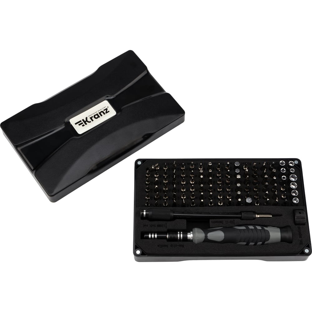 Отвертка с битами для точных работ KRANZ RA-05 CR-V, 106 предметов KR-12-4755 отлично подходит для ремонта телефонов, компьютеров, приемников и для многих популярных приборов, которые используются в быту. Выполнен из высококачественной хромованадиевой стали CR-V с высокой устойчивостью к коррозии и образованию ржавчины. Точно подобранные по характеристикам магнитные насадки отлично подходят для профессионального ремонта и для мелких бытовых работ. Посадка бит: 1/8 дюйма.