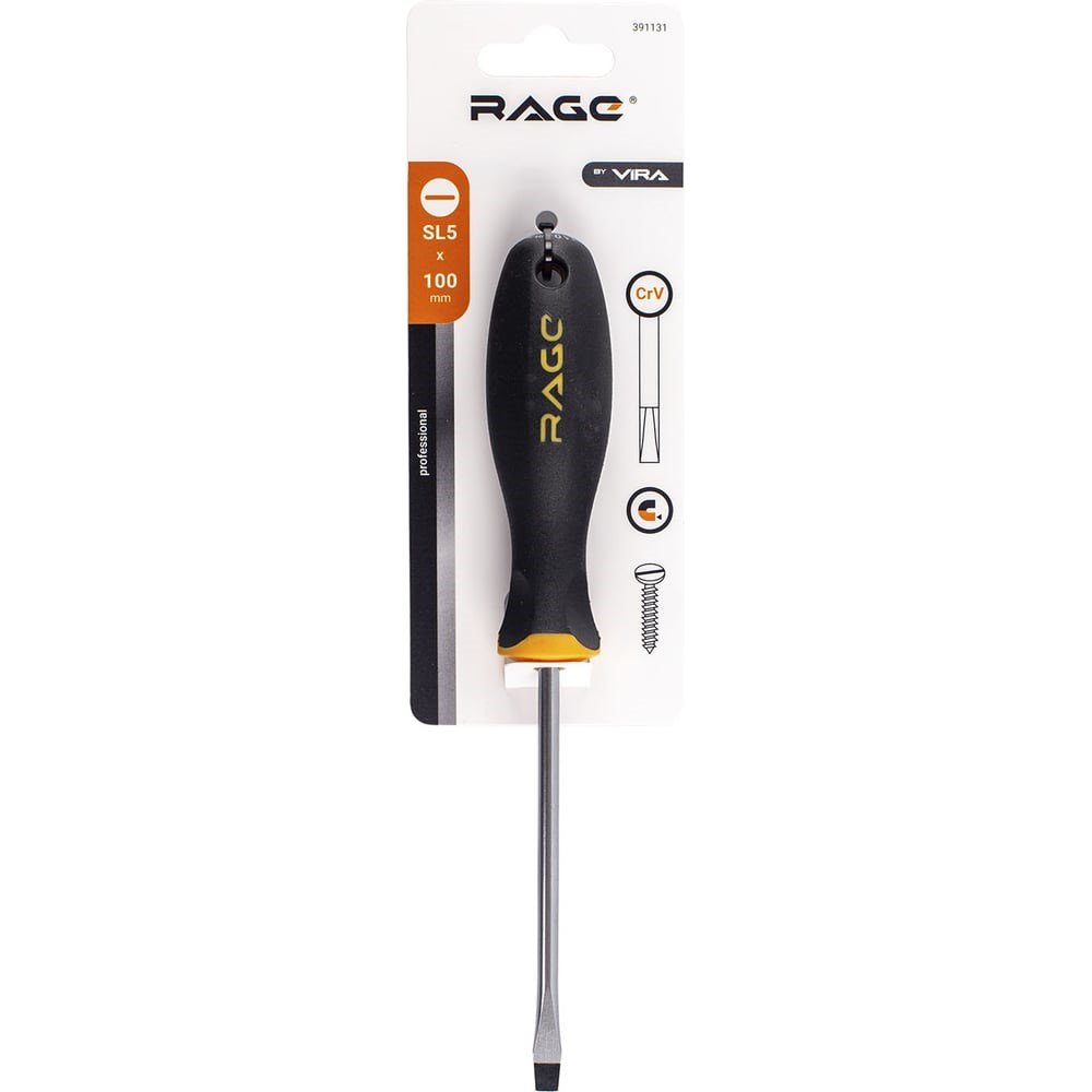 Отвертка шлицевая SL5X100 мм RAGE by VIRAОтвертка — это ручной инструмент, применяемый для откручивания и закручивания резьбовых крепежей, имеющих на головке шлиц. Стержень изготовлен из высококачественной легированной стали устойчивой к износу и истиранию с намагниченным наконечником. Геометрия жала соответствует промышленным стандартам. Двухкомпонентная рукоятка выполнена из пластикаABSи упругой резиныTPRделает ручку мягкой для вашей ладони и обладает антискользящим эффектом. Треугольная форма рукоятки снижает усталость при продолжительной работе и создает дополнительную опору при необходимости увеличения крутящего момента. Отвертка в два раза превосходит международный стандарт DIN по показателю предельного крутящего моментаХарактеристики:Тип шлица: SL5Ширина шлица (мм): 5Толщина шлица (мм): 0.8Длина жала (мм): 100Твердость (HRC): 48-52Материал жала: хромованадиевая сталь (CrV)Материал рукоятки: ABS-пластик, термопластичная резина (TPR)Особенность: магнитный наконечникНазначение: для откручивания и закручивания резьбовых крепежей, имеющих на головке