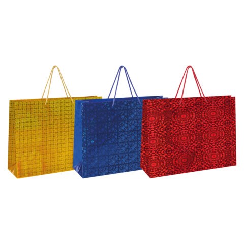 Голографический пакет изготовлен из мелованной бумаги с веревочными ручками из полипропилена и представлен в трех цветах и дизайнах. Выполнен в красном, золотистом и синем цветах. Размер - 70x16x50 см.