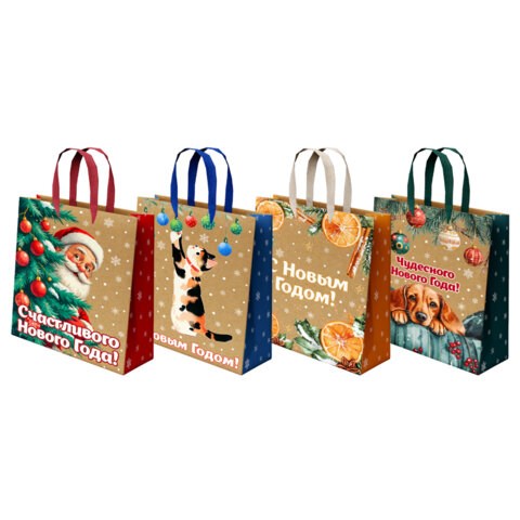 Подарочный пакет, как и все виды подарочной упаковки, способен придать особый статус подарку. Также он является достаточно практичным изделием, которое может использоваться в повседневной жизни. Подарочный новогодний пакет изготовлен из крафт-бумаги, снабжен ленточными ручками из полиэстера. Размер – 18х10х23см. На пакетах изображены иллюстрации в новогодней тематике и поздравительные надписи (ассорти без возможности выбора), которые точно вызовут улыбку.