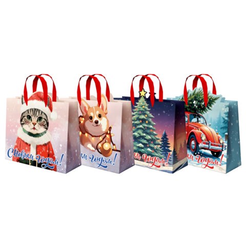 Подарочный пакет, как и все виды подарочной упаковки, способен придать особый статус подарку. Также он является достаточно практичным изделием, которое может использоваться в повседневной жизни. Подарочный новогодний пакет изготовлен из ламинированного мелованного картона, снабжен ленточными ручками из полиэстера. Размер – 26х13х32см. На пакетах изображены иллюстрации в новогодней тематике и поздравительные надписи (4 дизайна ассорти без возможности выбора), которые точно вызовут улыбку. Некоторым деталям иллюстрации добавлен 3D-эффект.