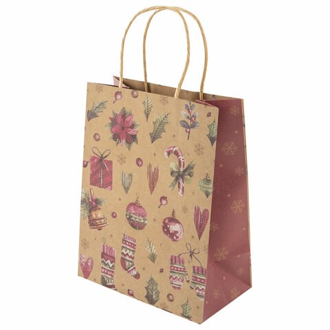Подарочный пакет новогодний изготовлен из крафт-бумаги, снабжен бумажными ручками. Размер – 18x10x23 см. Пакет украшен изображениями новогодних атрибутов.