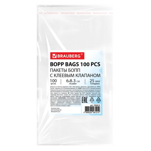 Пакеты БОПП с клеевым клапаном, КОМПЛЕКТ 100 штук, 6х8 + 3 см, 25 мкм, BRAUBERG, 700414