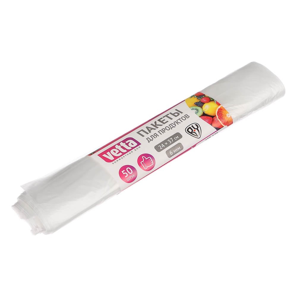 Пакеты для продуктов VETTA 50 шт., 24x37 см, в рулоне, полиэтилен, 6 мкм 438-125 гарантируют надежную защиту от воздействия окружающей среды, сохраняют качество и свежесть продуктов, исключают смешивание запахов. Универсальные пакеты достаточно вместительны и подходят для хлебобулочных изделий, мяса, сыров.