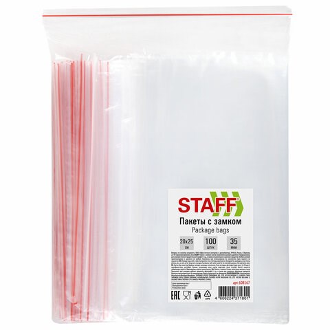 Пакеты с замком ZIP-LOCK "зиплок", комплект 100 шт., 200х250 мм, ПВД, толщина 35 мкм, STAFF, 608167