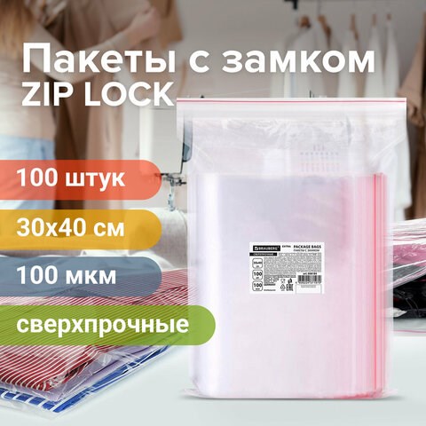 Пакеты ZIP LOCK "зиплок" СВЕРХПРОЧНЫЕ, комплект 100 шт., 300х400 мм, ПВД, 100 мкм, BRAUBERG EXTRA, 608184