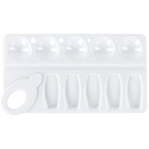Легко отмывается после использования. Имеет 5 отделений для смешивания красок и 5 отделений для размещения красок. Палитра прямоугольной формы с отверстием для удобства держания в руке изготовлена из высококачественного полистирола белого цвета. Размер - 21х11х0,8 см.