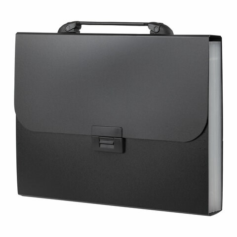 Портфель формата А4 (330х256х32 мм) изготовлен из плотного пластика стандартной фактуры толщиной 0,8 мм, выполнен в солидном черном цвете и имеет 7 отделений с индексными ярлыками. Складная ручка обеспечивает компактность изделия. Портфель застегивается на клапан.