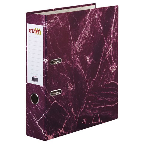 Папка формата А4 с вертикальной ориентацией изготовлена из качественного картона с покрытием под "мрамор". Ширина корешка в 70 мм позволяет разместить до 500 листов. Прорези для колец на внешней крышке позволяют оставаться папке закрытой даже при большом количестве бумаг, а надежный арочный механизм легко справляется с ежедневными нагрузками. Корешок снабжен этикеткой для маркировки содержимого, что позволяет структурировать информацию.