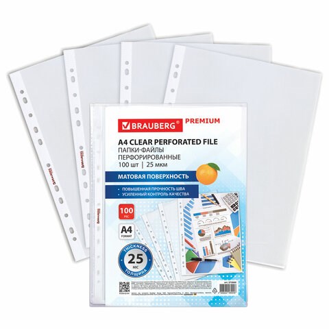 Папки-файлы перфорированные А4 BRAUBERG "PREMIUM", КОМПЛЕКТ 100 шт., матовые, 25 мкм, 273000