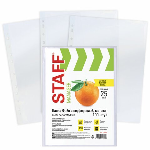 Перфопапки формата А4 с вертикальным размещением содержат универсальную перфорацию, а также имеют фактуру "апельсиновая корка" и прочные швы. Толщина пленки - 25 мкм, что подходит для хранения до 20 листов в 1 папке-файле. В комплекте 100 шт.