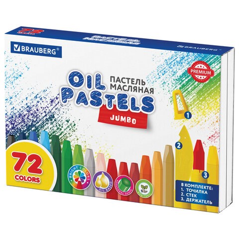 Пастель масляная восковые мелки утолщенные 72 цвета с точилкой, держателем и стеком, BRAUBERG PREMIUM, 272715