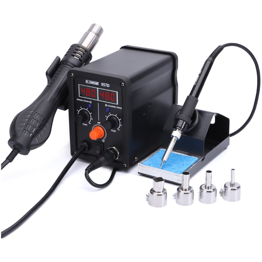 Паяльная станция Element 957D подходит для операций по распайке и пайке широкого спектра компонентов. Например SOIC, CHIP, QFP, PLCC, BGA, SMD и т.д. Устройство особенно подходит для операций по распайке на линейных разъёмах.