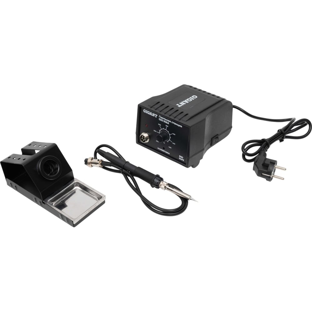 Паяльная станция Gigant 50Вт GSS-936A обеспечивает стабильный и быстрый нагрев, обладает регулировкой температуры, что позволяет использовать его с различными типами паяльных жал. Станция подойдет как радиолюбителям, для ремонта и изготовления электронного оборудования, так и профессионалам. Паяльная станция поддерживает точный контроль температуры с минимальной погрешностью. Диапазон температур для пайки: от 200 до 500°C. Настройка температуры происходит с помощью аналогового регулятора. Наличие индикатора нагрева позволяет легко отслеживать состояние станции. В комплект поставки входит всё необходимое для работы: подставка со специальной губкой, сам паяльник с жалом. Использование качественных материалов, таких как сталь, нержавеющая сталь, керамика и термостойкие пластики, обеспечивает долгий срок службы оборудования. Паяльные станции Gigant проходят специальное тестирование на старение, что гарантирует ее надежность в эксплуатации. Небольшие габариты паяльной станции (150x115x91 мм) и легкий вес (1.38 кг) позволяют легко её переносить и хранить. Длина кабеля паяльника - 1.1 м достаточна для удобной работы. Дополнительные характеристики: Степень защиты: IP20 Рабочий ток: 0.054 А (без нагрузки), 0.195 А (под нагрузкой) Точное поддержание температуры ±1С° Напряжение питания: 220-240V AC.