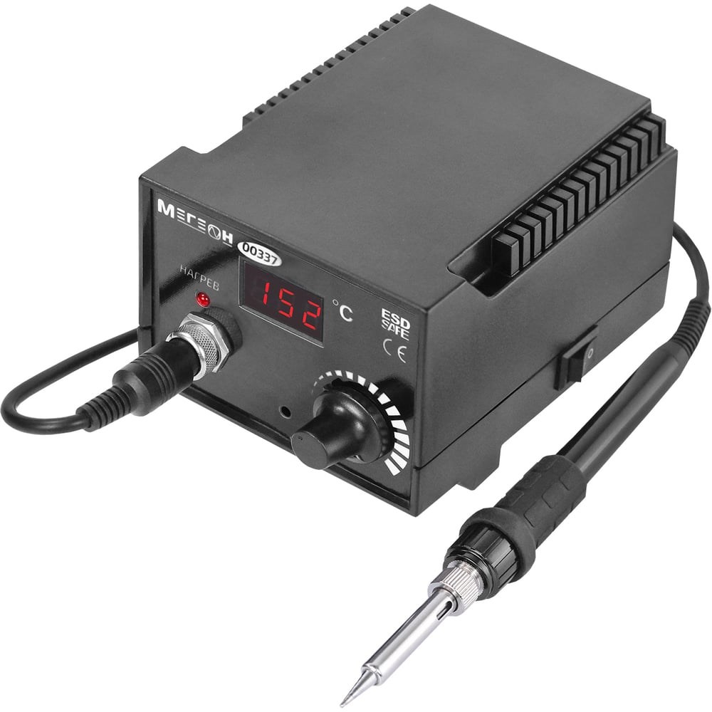 Паяльная станция МЕГЕОН 00337 к0000019536 – это удобный паяльник увеличенной мощности до 75 Вт с ярким светодиодным дисплеем и аналоговым регулятором установки температуры. Немаловажным преимуществом при работе с паяльником является маленький вес, мягкий провод и компактные размеры блока управления. На рукоятке предусмотрена резиновая накладка противоскольжения. Жало паяльника имеет распространённый типоразмер 900М-Т. Благодаря этому имеется большое количество сменных наконечников разной формы и размеров (в комплект не входят) для осуществления специфической пайки. В дополнение к написанному можно добавить ещё одно преимущество и это автоматическое поддержание установленной температуры паяльника. Для исключения повреждения радиокомпонентов статическим электричеством станция имеет функцию антистатической защиты. Прибор по достоинству оценят профессионалы и любители.